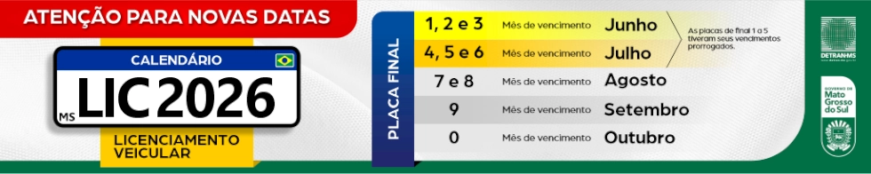 O Departamento Estadual de Trânsito de Mato Grosso do Sul (Detran-MS) publicou, na edição desta segunda-feira (13) do Diário Oficial do Estado, a Portaria nº 209/2026, que altera o calendário anual de licenciamento de veículos para o exercício de 2026.