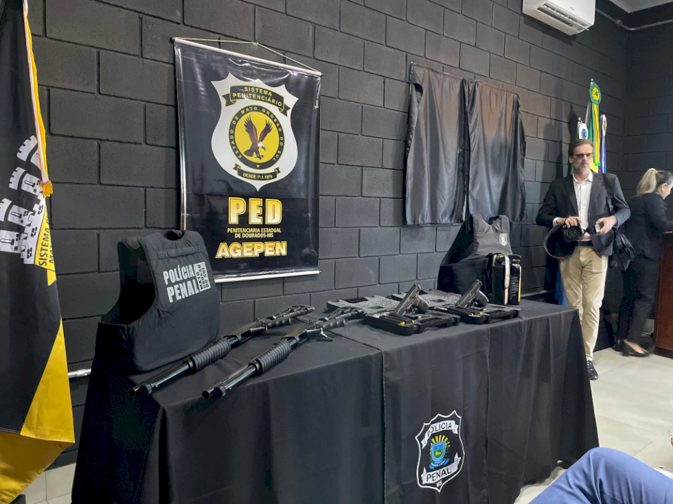 Maior presídio de Mato Grosso do Sul, a PED (Penitenciária Estadual de Dourados) recebeu uma viatura semiblindada, novos armamentos e coletes balísticos, em ato nesta terça-feira (8). A entrega foi feita pela Agepen (Agência Estadual de Administração do Sistema Penitenciário) com a presença do vice-governador José Carlos Barbosa, o Barbosinha.