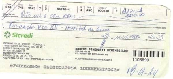 Na petição, a instituição diz que o ex-prefeito emitiu um cheque, em 25 de novembro de 2023, no valor de R$ 8,1 mil para quitar a dívida contraída no leilão beneficente. O hospital tentou efetuar o depósito, mas foi impedido por motivos da alínea 11/12 (cheque sem fundo). A ação foi protocolada no TJMS (Tribunal de Justiça de Mato Grosso do Sul) em 24 de dezembro de 2025.