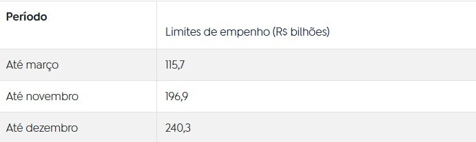 O decreto também detalha o cronograma consolidado dos limites de empenho ao longo do ano. Os valores, em bilhões de reais, ficam distribuídos da seguinte forma: