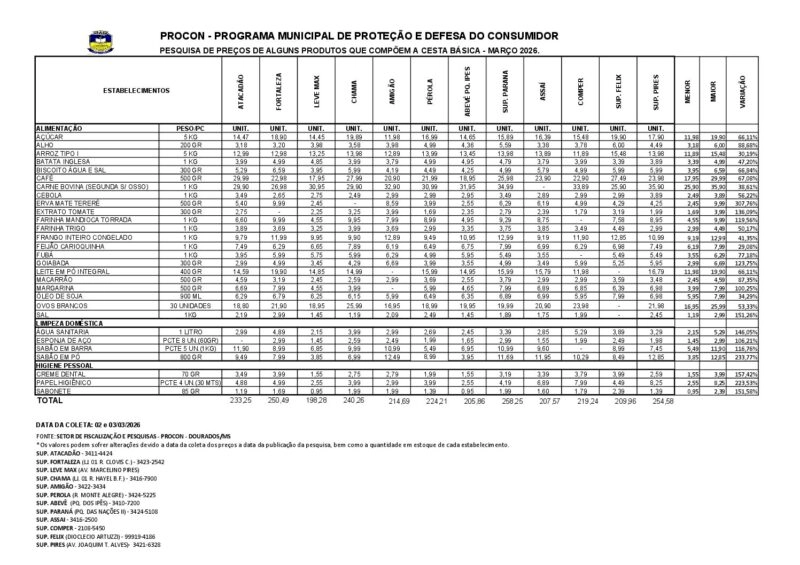 O Programa Municipal de Proteção e Defesa do Consumidor de Dourados (Procon) identificou variações expressivas nos preços dos produtos da cesta básica em Dourados. O levantamento foi realizado nos dias 2 e 3 de março, em 12 supermercados da cidade, e analisou 29 itens de consumo essencial.