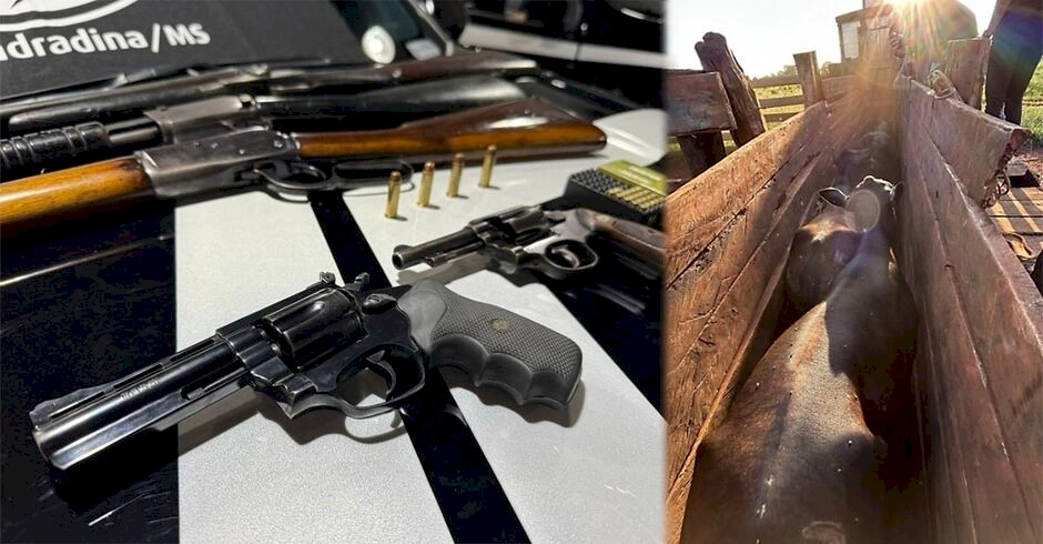 Durante as buscas na propriedade, os policiais também localizaram cinco armas de fogo, dois revólveres e três espingardas, além de munições.